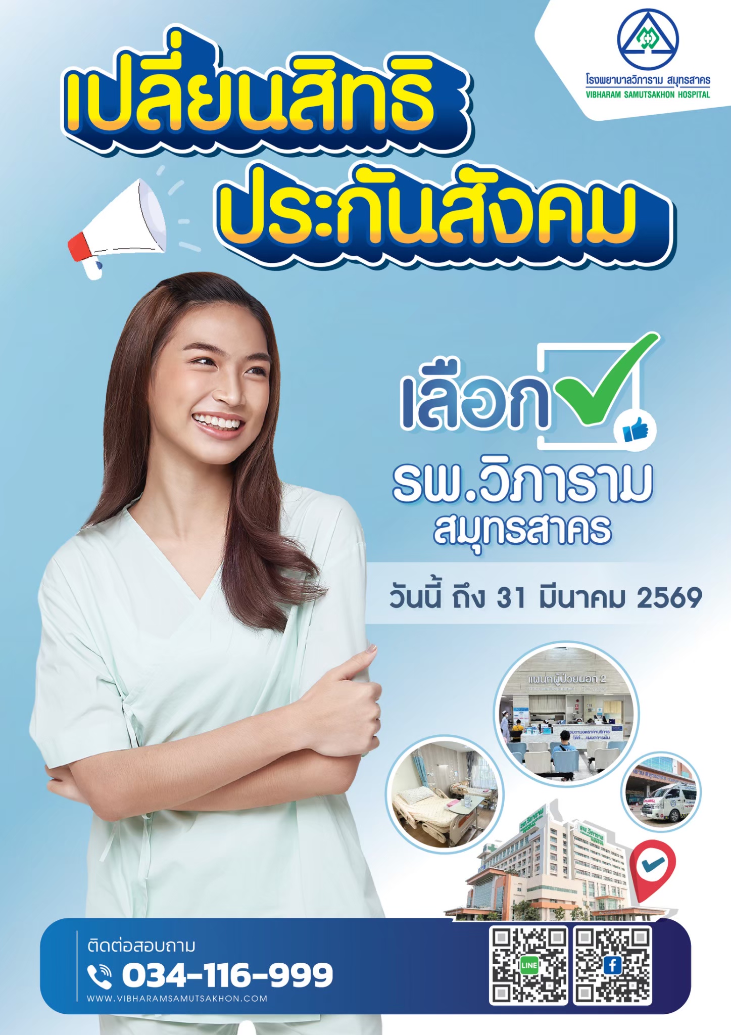 โรงพยาบาลวิภาราม สมุทรสาคร เปิดรับย้ายสถานพยาบาลประกันสังคมได้ ตั้งแต่วันนี้ - 31 มีนาคม 2568